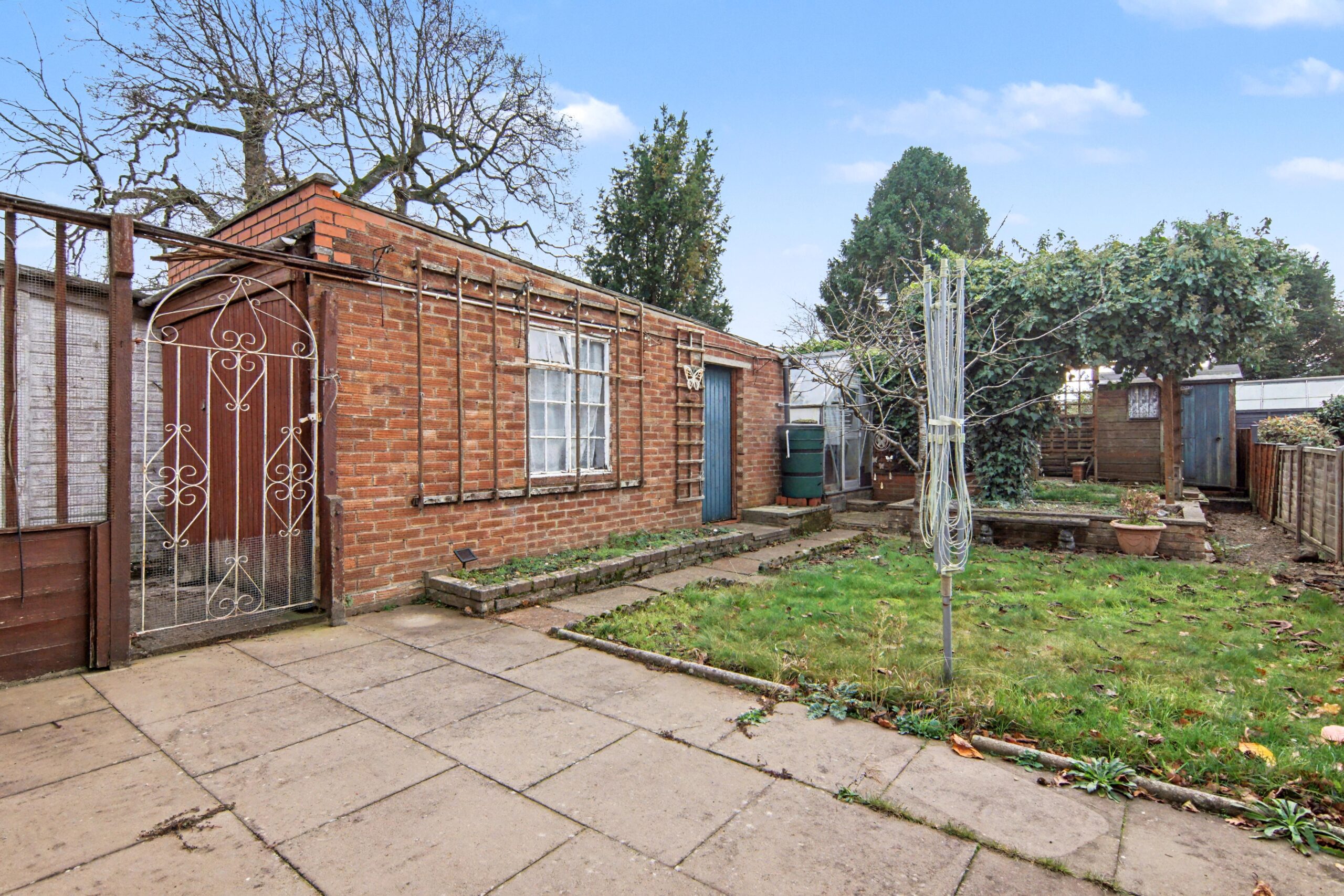 Rear: Lawn | Patio Area | Shed | Shrubs | Outbuildings